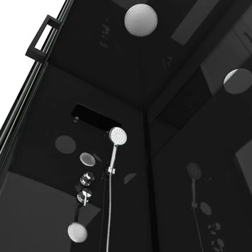 Deze strak ontworpen zwarte douchecabine van Aurlane is perfect wanneer je iets minder ruimte in de badkamer hebt. De cabine beschikt namelijk over een schuifdeur in de hoek. Daardoor heb je geen extra ruimte nodig om de deuren te kunnen openen. De wanden zijn gemaakt van 4 mm dik veiligheidsglas. Daar bovenop heeft de cabine een ingebouwde regendouche, een handdouche en 2 grote waterjets. De douchebak van deze Aurlane Douchecabine met Schuifdeur Black Mirror 2 Rechthoek Zwart 80×110 cm heeft een ondersteuningsframe met steunpoten. De hele set bestaat uit een centrale douchekolom, een douchebak, een voorzijde in zwart veiligheidsglas van 4 mm dik en een set achterwanden in zwart acryl. Deze cabine is ook beschikbaar in een vierkante en kwartronde uitvoering.